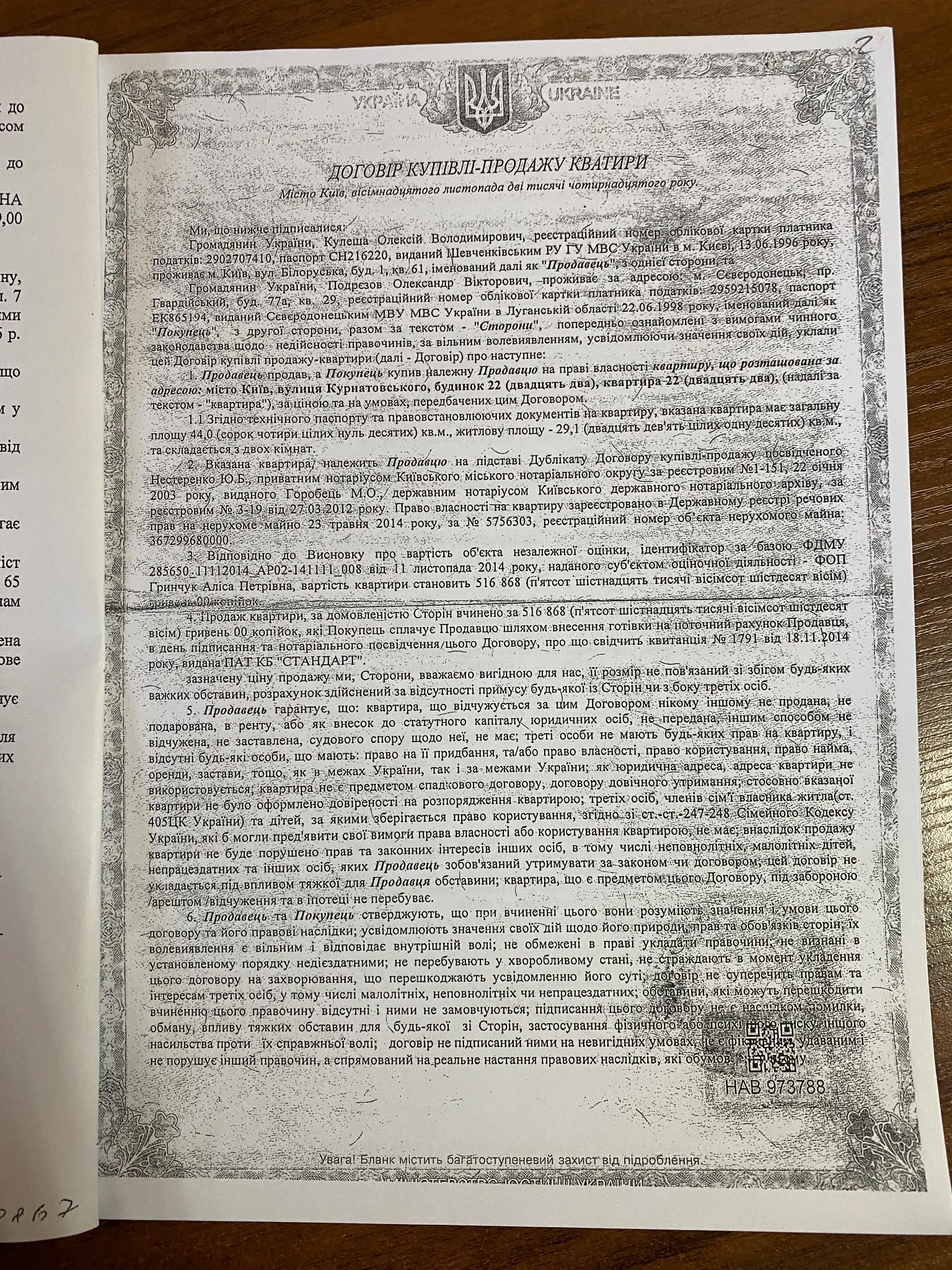 Поддельный договор купли-продажи был принят для совершения сделки нотариусом Захарченко Т.С. с грубыми нарушениями процедуры. В нотариальном деле отсутствовала обязательная ксерокопия ИНН продавца (Подрезова О.В.), что является серьезным нарушением. Договор был подписан человеком, выдававшим себя за Подрезова, в то время как настоящий владелец находился за пределами Украины.